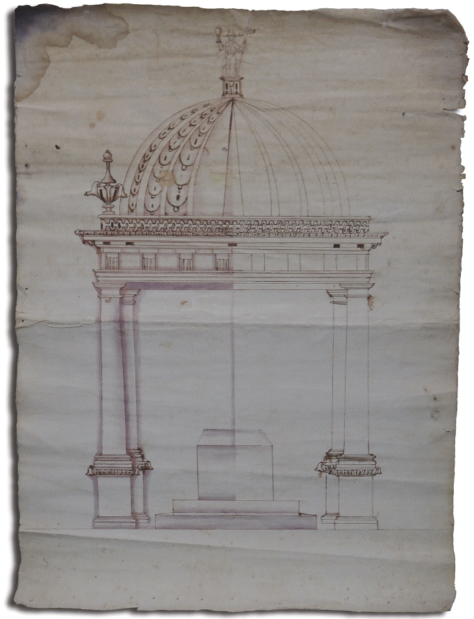 El alzado del arco triunfal que representa este dibujo se debe entenderlo como la lógica suma final y resultado del desarrollo y planteamiento de un trabajo previo de diseño consensuado entre los religiosos y los artistas. Es la traslación conclusiva al documento de toda una serie de ideas que convinieron trazarse en múltiples bosquejos en los que se fueron definiendo sus formas y elementos principales, más aún si se tiene en cuenta que debía ser el perfecto marco contenedor para las múltiples "figuras, jeroglíficos, letras y lo demás" estipuladas por los capitulares desde junio del año anterior.17 Se trataba de "estatua y lienzos de frecuente alegoría mitológica, descifrada en rima epigráficas", previamente ideadas, a las que por ejemplo aludía para otros casos Alfonso Méndez Plancarte,18 y que aquí tienen cada una su espacio definido. Esto da sentido tanto a su manera de ejecución como a su encajado en el pliego -algo corto en el remate superior-, además de la seguridad en los trazos y ausencia de correcciones y ajustes.
