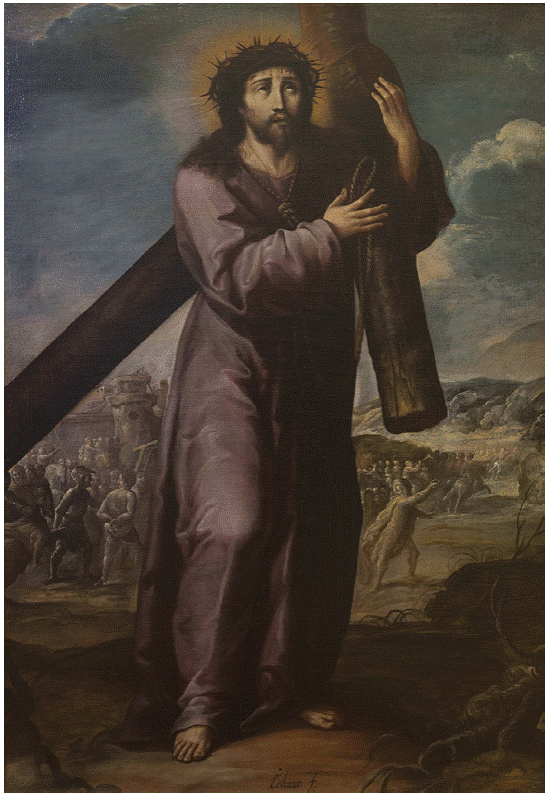 Como señalara Velia Morales, Pedro de Benavides al igual que Rodrigo de la Piedra, junto con "Gaspar Conrado, Pedro de Vergara, Luis de Acevedo, Juan de Cejalbo y otros más, trabajaron desde fechas muy tempranas en la ciudad y permanecieron casi todos en ella el resto de sus vidas", refiriendo que al igual que Chacón, Vergara y Acevedo, forjaron "los cimientos de lo que para algunos puede considerarse una tradición pictórica poblana".57 Varios de estos pintores son junto al flamenco Diego Borgraf, señalados por Francisco Pérez de Salazar cuando en agosto de 1648 se comprometieron a realizar las pinturas nece sarias para los nuevos retablos de la catedral palafoxiana en un momento de máxima vorágine constructiva y ornamental,58 lo que insiste en la importancia de nuestro pintor. Aunque se cuenta con diferente documentación de encargos, la aceptación de aprendices y algún que otro testimonio,59 de su arte por desgracia casi nada se ha identificado. Es conocida su representación de Jesús llevando la Cruz de la iglesia del Carmen de Puebla, que ostenta su firma bajo los nuevos estratos de color que bien pudo aplicarle en una posible restauración o renovación Baltasar de Echave Rioja, quien lo firmara al calce y prácticamente sobre la anterior (Fig. 9).60