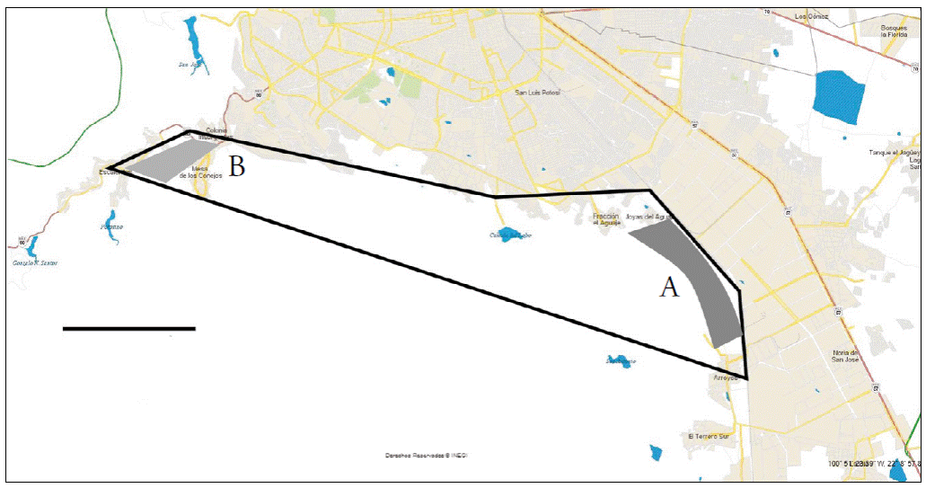 En particular me enfocaré en el análisis de dos zonas comprendidas dentro del polígono formado a partir de la comunidad de Arroyos (100° 53' 56.32" W, 22° 3' 41.61" N), siguiendo la base de las estribaciones de la sierra de San Miguelito, hacia el poniente, hasta llegar a la fracción del Aguaje (100° 55' 33.88" W, 22° 6' 19.29" N) y de ésta, continuando por el derrame del macizo hasta llegar a la comunidad de Escalerillas (101° 4' 31.98" W, 22° 6' 34.34" N) (Fig. 1). La primera zona, que he denominado con la letra A, es aquella donde se encuentran las canteras más antiguas de San Luis Potosí, explotadas ex profeso para uso arquitectónico; en tanto que la zona B es la fuente actual de explotación de piedra toba para la ciudad y la región. Cada una de estas zonas presenta características particulares tanto históricas como geofísicas y de explotación. Baste decir, como comentario inicial, que estas diferencias tendrán su repercusión cuando abordemos el aspecto de la historia de la explotación de estos bancos, pues una característica física es que son rocas porfiríticas12 de diferente dureza y con una tonalidad que va del gris claro a un gris rosáceo, pasando por tonalidades cremas, violáceas y purpúreas; son estos matices los que se toman en cuenta para su diferenciación y, en algunos casos, para su uso y destino.