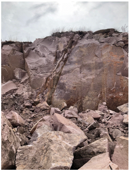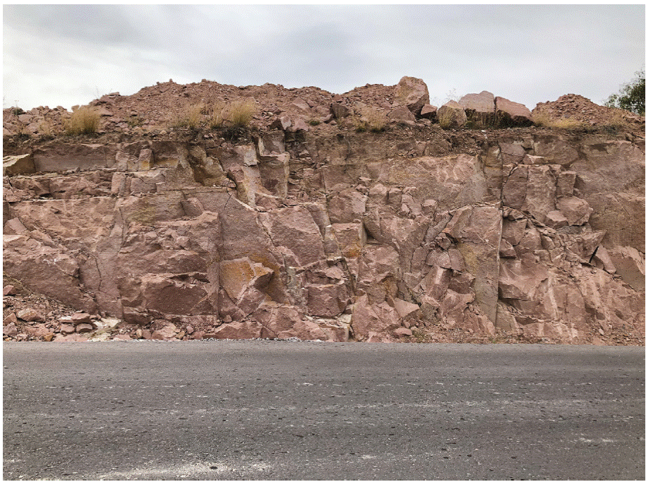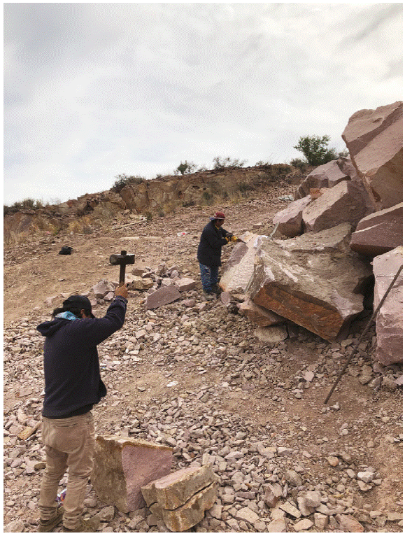 En relación con este sitio realicé también un ejercicio de localización, para llegar a la zona en la que se encontraba la cantera denunciada por Antúnez de Miranda. Al subir la falda de la sierra, hacia la parte posterior del cerro La Cantera, se encuentran unas vetas de piedra rosa que aún son explotadas por habitantes de la comunidad del Aguaje. Si bien no encontré referencias toponímicas para este caso, sí pude constatar la explotación de piedra que en toda la zona se lleva a cabo. En particular un cerro con piedra rosada, similar a la empleada en las construcciones más antiguas de la ciudad, se encuentra en los 22° 4' 56" N, 100° 55' 41" O, y a 1960 m s.n.m. (Figs. 5, 6 y 7). Fue en este sitio donde entrevisté a algunos trabajadores de la piedra; sobre esto habré de volver.