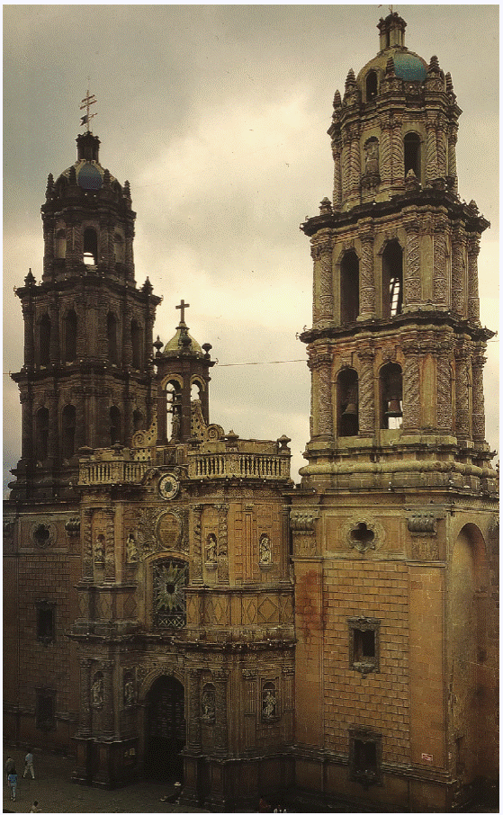 Si en la Ciudad de México la "cantera" blanca, la chiluca y el tezontle, con sus matices de rojo intenso, caracterizaron la arquitectura de los siglos XVII y XVIII, en San Luis Potosí las diferencias se daban apenas por el cambio de tonalidad de la piedra que se extraía en sus alrededores. Un ejemplo muy interesante y que ilustra esta situación es el de la torre norte de la catedral potosina, construida a principios del siglo XX para conmemorar el centenario de la Independencia y con ello mejorar la apariencia de un edificio que se erigió a principios del XVIII.15 La construcción, que se llevó a cabo en 1910, tuvo el inconveniente de que el color de la piedra con que se contó en aquel momento no coincidía con el de la piedra de la construcción dieciochesca. Así, el color oscuro de la torre nueva delataba que el material provenía de canteras del norte del valle, a diferencia de la cantera rosa original, que venía del sur (Fig. 2).