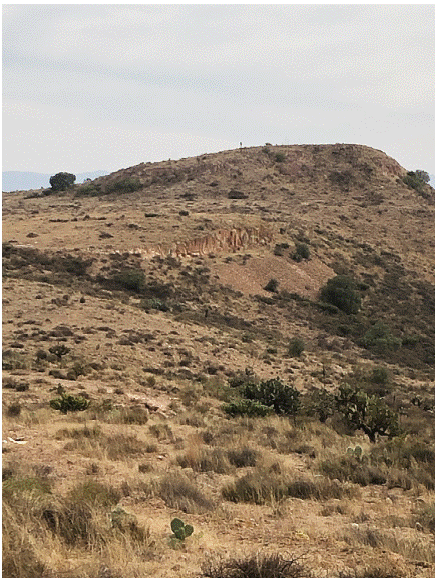 La distancia corregida y asentada por el escribano permite determinar, con mayor o menor exactitud, la ubicación de ese primer banco de cantera registrado en San Luis Potosí. Al tomar como punto de partida el antiguo límite del pueblo de españoles de San Luis Potosí (lo que en la actualidad es la calle de Pascual M. Hernández) con dirección hacia el sur y siguiendo el rumbo de lo que era el camino real a México, se llega a la actual zona industrial. Si se entra por el Eje 122, a 10 kilómetros aproximadamente (o lo que es lo mismo, dos leguas) de nuestro punto de partida, justo en el piedemonte del plegamiento cerril de la sierra de San Miguelito, se encuentra un cerro que lleva por nombre La Cantera, localizado en 22° 4' 40" N, 100° 54' 57" O, a 1908 m s.n.m. el cual muestra algunos rastros de explotación de piedra (Figs. 3 y 4). Las características físicas de la piedra del lugar (blanca con un ligero tono rosáceo, como el que caracteriza a muchas edificaciones del centro de la ciudad), sumadas a la distancia coincidente con el documento referido, nos hace pensar que se trata, si no de la cantera, sí por lo menos de la zona registrada por Benito de Antúnez en 1595. Más aún, la toponimia del lugar (cerro La Cantera) resulta ser más que una simple coincidencia. Esta zona queda referida en la figura I dentro del polígono señalado con la letra A.