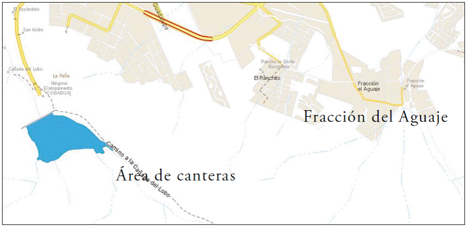 La cantera de la porción sur-suroeste del valle de San Luis Potosí se siguió extrayendo a principios del siglo XX, de hecho, algunos asentamientos humanos se desarrollaron también a partir de la explotación de la piedra en la zona. Uno, acaso muy olvidado ya, es el correspondiente a la fracción del Aguaje. Este asiento se ubica entre la falda de la sierra de San Miguelito y el boulevard Antonio Rocha Cordero (periférico sur) (Fig. 8). La principal actividad económica hasta hace algunos años era la extracción y el trabajo de piedra de las canteras aledañas, o sea, la explotación del material pétreo inaugurada en San Luis por el primer denuncio que hiciera Benito Antúnez en 1595.