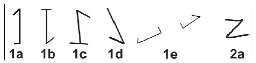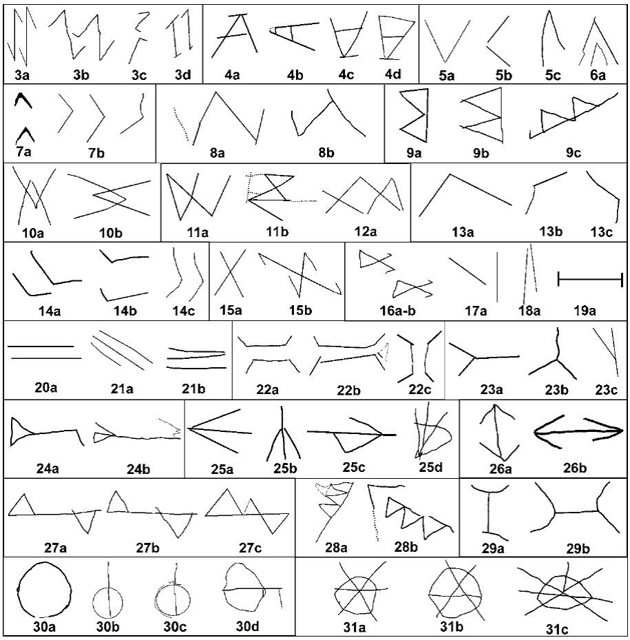 Por la condición intelectual de los picapedreros resulta complicado encasillar a algunos signos moqueguanos en esta categoría. De manera condicional (Fig. 3) colocamos en esta clase a la letra Z (2a) y al número 1; de éste llama la atención una variante por pares trazados en diagonal y en posición especular (ie). Grabados como 4, 5, 30a y 46 (semejantes a las letra A, V, E y O) podrían ser asimilados a esta categoría pero sus muchas variantes hacen dudar sobre su carácter alfanumérico, por lo que se consideran geométricos, siguiendo la ya expresada convicción de que los picapedreros eran iletrados y que usaron estos signos por mera asociación con otras referencias visuales y mnemotécnicas; así, por ejemplo, los signos de tipo A podrían estar inspirados en los compases y escuadras, instrumentos de uso común en la albañilería y cantería de esos tiempos.