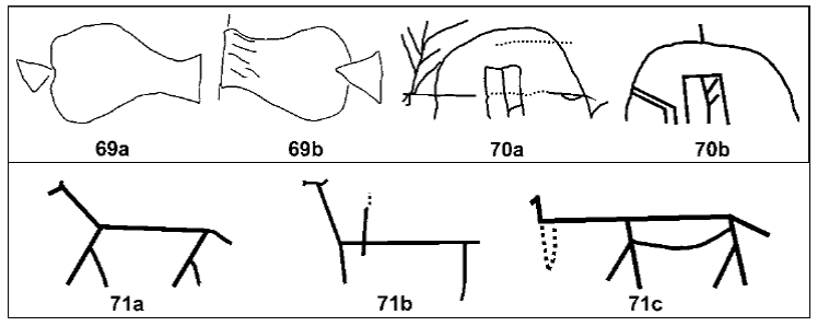 La primera impresión es que todas son marcas de cantería; sin embargo, hay ciertos indicios que conducen a dudar de tal condición en al menos los tipos 70 y 71, las dos casas en forma de domo y las tres figuras que corresponden a camélidos o, eventualmente, a equinos. Con relación a las casas (Fig. 7), a su individualidad, se suma la relativa complejidad de la composición gráfica, ambas con puertas de doble hoja, la 70a con una planta al costado, mientras que la 70b tiene un ornamento lateral de dos líneas paralelas en ángulo, detalles que las harían impropias para servir como marcas de cantería.