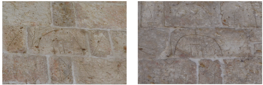 Hay hasta tres tipos de marcas que podrían incluirse en esta categoría (Fig. 6): el cántaro (69), los zoomorfos (70) y las casas (71). Los cántaros, con muchas variaciones, son los más abundantes de este grupo, mientras que los tres animales y las dos casas son ejemplares únicos. Por su cantidad y su esquema repetitivo, resulta evidente que la figura del cántaro es una marca de cantería, mientras que, como se verá en la siguiente sección, por su concepción e individualidad, las casas y los animales podrían caer en alguna otra categoría simbólica.