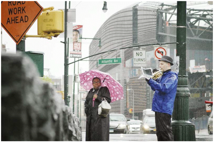 El primero de los artistas a los que haremos referencia, Craig Shepard, conjuga en sus piezas el caminar con la escucha profunda del medio. Entre sus obras se incluye On Foot: Switzerland. 31 days and250 miles,52 para la que cada día componía una nueva pieza que interpretaba al aire libre esa misma noche, y On Foot: Brooklyn. 91 days. 13 new pieces. 780 miles on foot,53 en la que pasea durante 91 días por la ciudad inspirándose de su atmósfera para componer una pieza al final de cada semana y ejecutarla en público (Fig. 1). En su web On Foot54 explica que el objetivo de sus creaciones musicales es "invitar a la gente a vivir la belleza de los sonidos en los que se mueve en su día a día".55