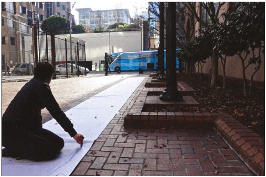 Esta lentitud extrema de los cuerpos en movimiento es, de igual forma, el argumento seguido por Tracy Taylor Grubbs al realizar -también en colaboración con la coreógrafa Hope Mohr- su pieza Slow Line Feb. 4, 2015,58 donde la lentitud, la atención, el cuidado extremo y lo real se contraponen con la velocidad y lo virtual.59 En San Francisco, en plena hora pico, extendieron por la acera un rollo de papel blanco con una longitud de 45 metros sobre el que emprendieron una extraña danza a ras de suelo, en la que se transformaban en las criaturas más lentas de la calle, al dibujar una línea de arabescos que reflejaba sus movimientos mientras se arrastraban y gateaban sobre el papel blanco, metáfora de una frontera entre un invisible mundo poético, potencialmente siempre a nuestro alcance, y el utilitario que nos atrapa en la prisa y del que con dificultad conseguimos escapar. "Éramos dos mujeres disfrutando del inútil, pero tan necesario acto de dibujar una línea lenta", explica la artista (Fig. 3).60