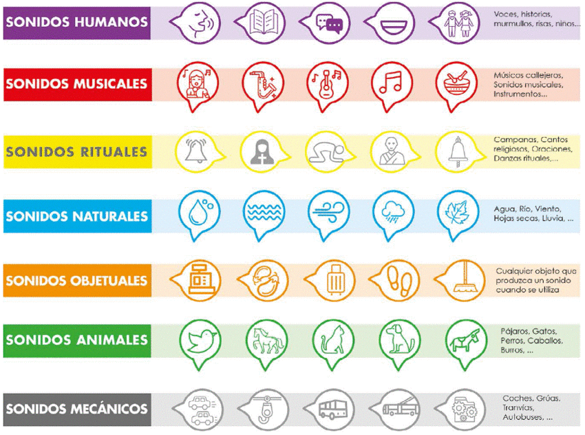 Los sonidos se han organizados en siete grupos -sonidos humanos, animales, naturales, objetuales, mecánicos, rituales y musicales-, cada uno con un color específico correspondiente al color de la ruta a pie para escucharlo. Cada grupo de sonidos contiene, a su vez, varios tipos de sonidos representados por distintos iconos. Por ejemplo: los sonidos humanos incluyen las voces de diferentes edades, los distintos idiomas, las risas, los gritos, los murmullos, etc. Los sonidos naturales presentan iconos de agua, río, fuente, lluvia, viento, hojas secas, etc. El número de posibles iconos es ilimitado, así como son infinitos los sonidos potenciales. Una vez más, es una invitación a la escucha de la diversidad (Fig. 9).