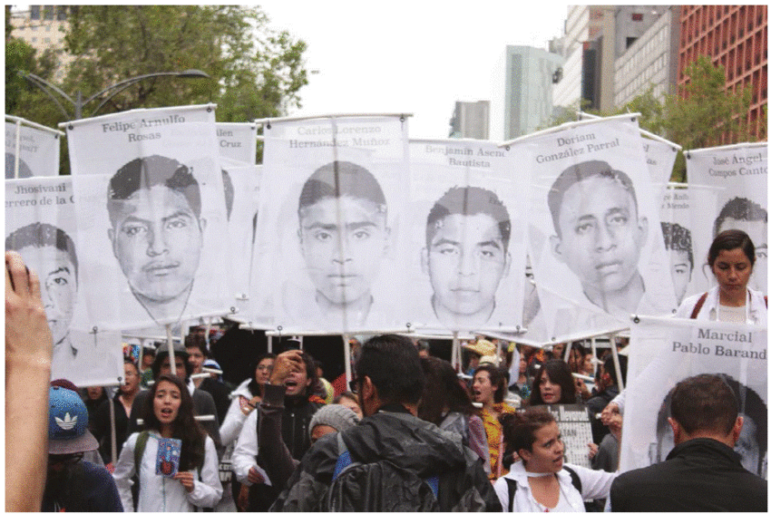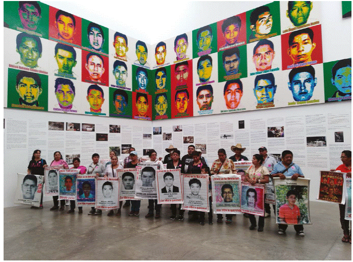 La desaparición de los estudiantes de Ayotzinapa y la rápida denuncia de los hechos por parte de organismos de derechos humanos, haciendo un llamamiento internacional a reaccionar ante el caso, hizo posible que de manera inmediata, el 3 de octubre de 2014, la Oficina para el Alto Comisionado de Naciones Unidas por los Derechos Humanos calificara el caso como "uno de los sucesos más terribles de los tiempos recientes".71 Después vendrían las movilizaciones en todo el país y en el extranjero que, por su magnitud y multiplicidad, no tienen precedente en la historia reciente.72 De esa manera, la tragedia de Iguala hizo evidente la crisis de derechos humanos en el país y suscitó la preocupación de numerosos artistas quienes se unieron a las movilizaciones y comenzaron a tematizar los hechos.
