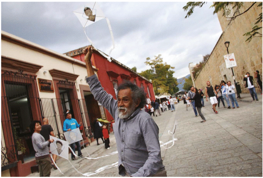 El 28 de diciembre de 2014 el artista Francisco Toledo elaboró 43 papalotes en tela color blanco en los cuales estampó con esténcil los rostros de los estudiantes desaparecidos enmarcados en una figura de un diamante. Las piezas fueron realizadas en colaboración con trabajadores del Taller Arte y Papel de San Agustín Etla, alumnos de primaria de distintas escuelas de la ciudad y asiduos del Instituto de Artes Gráficas de Oaxaca. Los papalotes se echaron a volar en el andador turístico de la ciudad de Oaxaca en tres ocasiones (Figs. 2 y 3).