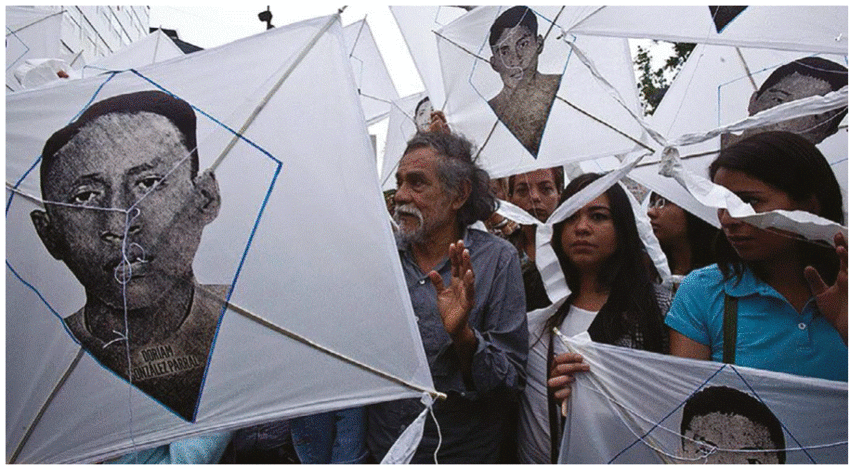 Así, los significados materializados en Papalotes inciden en la causa política sintetizada en la consigna "Vivos se los llevaron, vivos los queremos", que reclama al Estado la responsabilidad de dar cuenta del paradero de los estudiantes y llevar a cabo procesos de justicia, y también en la causa humanitaria que permitiría a los familiares y a la sociedad, si eso fuera posible, cerrar el ciclo de existencia de las persona desaparecidas al ensayar el trámite del duelo que pudiera ayudar a superar "la ausencia", "el hueco", "el vacío", en suma "la quiebra del sentido que deja la desaparición".24 Por esa vía, al solidarizarse con los afectados25 y al incorporar tradiciones relacionadas con los procesos de duelo, la pieza ubica el problema de la desaparición de los estudiantes en la esfera pública y apela a la empatía.26 Además, y de manera importante, Papalotes le restituye al arte una función dentro de la comunidad.