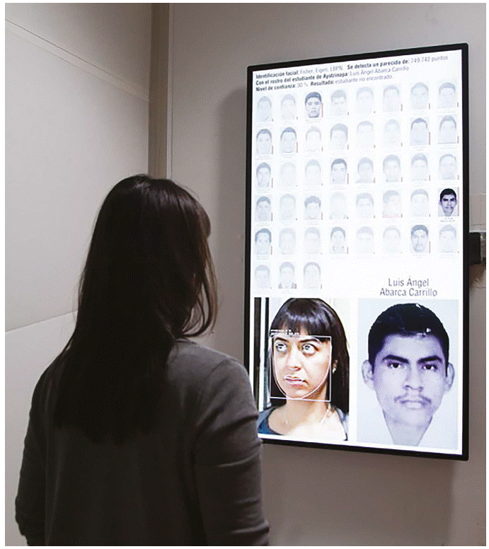 En este horizonte, la desaparición de los 43 normalistas no fue un evento aislado, muchos miembros de sus familias habían sido perseguidos, asesinados y desaparecidos o habían sufrido similares violaciones a sus derechos fundamentales.39 No obstante, sus denuncias no fueron escuchadas por las autoridades, el único acompañamiento con el que contaron fue el de los organismos de defensa de los derechos humanos.40 La atención prestada a los casos de Alejandro Martí41 e Isabel Miranda de Wallace,42 cercanos a los grupos en el poder por su pertenencia a las élites criollas, es una muestra de que en México la práctica de la justicia sigue racializada. Quizá por esa razón Rafael Lozano-Hemmer declaró que su deseo era que su pieza contribuyera a que la tragedia de Iguala se personalizara de modo que, por ejemplo, "Enrique Peña Nieto se viera ante este espejo biométrico y descubriera qué estudiante tiene los rasgos faciales más parecidos a los de él, para generar empatía, intimidad y una sensación de responsabilidad y parentesco."43