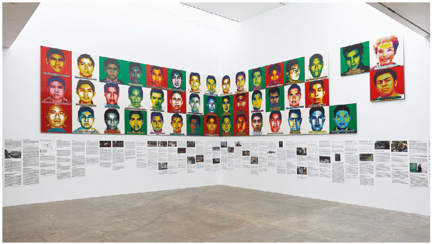 Desde diferentes perspectivas, las piezas que analizaré en este texto se inscriben en los horizontes del litigio artístico porque comparten el hecho de haber sido realizadas por artistas autónomos e independientes, es decir, que no han sufrido directamente los hechos que tematizan en sus obras,5 y quienes por voluntad propia decidieron "exponer en la palestra pública una situación de impunidad, anormalidad, injusticia, indiferencia social y estatal".6 Estas piezas se refieren al delito de desaparición forzada contra los 43 estudiantes y el asesinato de otros tres; buscan dignificarlos; incorporan los derechos de verdad y memoria; se sitúan del lado de los familiares y pretenden apoyar en el trámite seguido a la tragedia;7 asimismo, buscan un efecto sensibilizador que genere empatía y solidaridad y permita al público acercarse a la realidad atroz del caso Ayotzinapa.8
