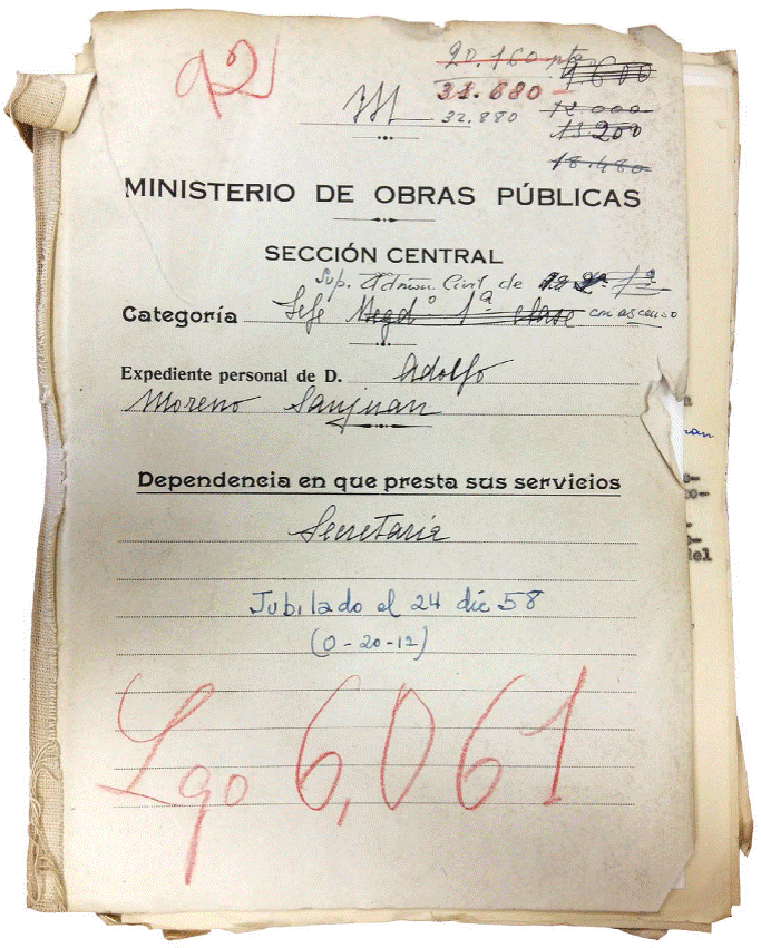 Su hoja de servicios27 resulta bastante caótica durante los años anteriores a la Guerra Civil: escribiente de tercera temporero hasta noviembre de 1918, auxiliar de tercera, segunda y primera clase entre 1918 y 1922 y oficial de administración de tercera y de administración civil hasta la II República; durante ese tiempo acumuló una buena cantidad de licencias por asuntos personales o bajas por enfermedad que iba encadenando unas tras otras y que le costó algún apercibimiento por su conducta. A partir de la posguerra, gracias a la exención de depuración laboral,28 su situación se estabilizó e inició una serie de ascensos constantes: durante la década de los años cuarenta, como jefe de Negociado de tercera, segunda y primera clase; durante la década de los años cincuenta, como jefe de Administración de tercera, segunda y primera clase; hasta que, en 1958, ya con el cargo de jefe superior del Cuerpo de Administración Civil, cumplió la edad reglamentaria de 70 años y se jubiló definitivamente.