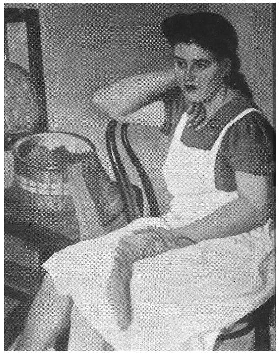 En 1940, después de tres largos lustros desvinculado de la Asociación de Pintores y Escultores, había recibido una circular en la que se anunciaba la recomposición total de su Junta Directiva y sus renovados propósitos. Pese al desconocimiento de estos artistas y el recelo ante la propuesta, la intercesión de su mujer determinó un cambio de actitud y accedió a reintegrarse.69 La pertenencia a la Asociación le permitiría más adelante participar con otros miembros en algunas exposiciones colectivas, por ejemplo el Salón de Primavera celebrado en Palma de Mallorca en 1945,70 una de bodegones en la Galería Pereantón en enero de 194971 o la del cuadragésimo aniversario en el Salón Dardo,72 así como retomar la rutina de los Salones de Otoño una vez desestimada la opción de las Nacionales: en 1943 presentó dos óleos con el título Brillosy reflejos;73 en 1944, otros dos, La espera y Añoranza del domingo (Fig. 3);74 en 1945-1946, Meditación;75 en 1950, Sinfonía de gamas frías y María Dolores;76 en 1952, Retrato (Fig. 4) y Jarro con cardos;77 y en 1954, Recreación78, Aunque ya había asumido ser "incapaz de alcanzar un relieve notable en el Arte", las buenas colocaciones y reseñas le alentaban para seguir alcanzando a los buenos pintores y hasta avivaban la envidia de éstos, que se acercaban para tantear su capacidad de influencia; pero "como no intrigo, ni me quejo, ni exijo, ni molesto ni alboroto, de mí nadie se acuerda ni se preocupa. ¡Qué vamos a hacerle! No puedo ser de otra manera" -se lamenta Adolfo, resignado- "aunque sí me apena la poca consideración y el poco afecto que a mi persona se le tiene, después de todo".79