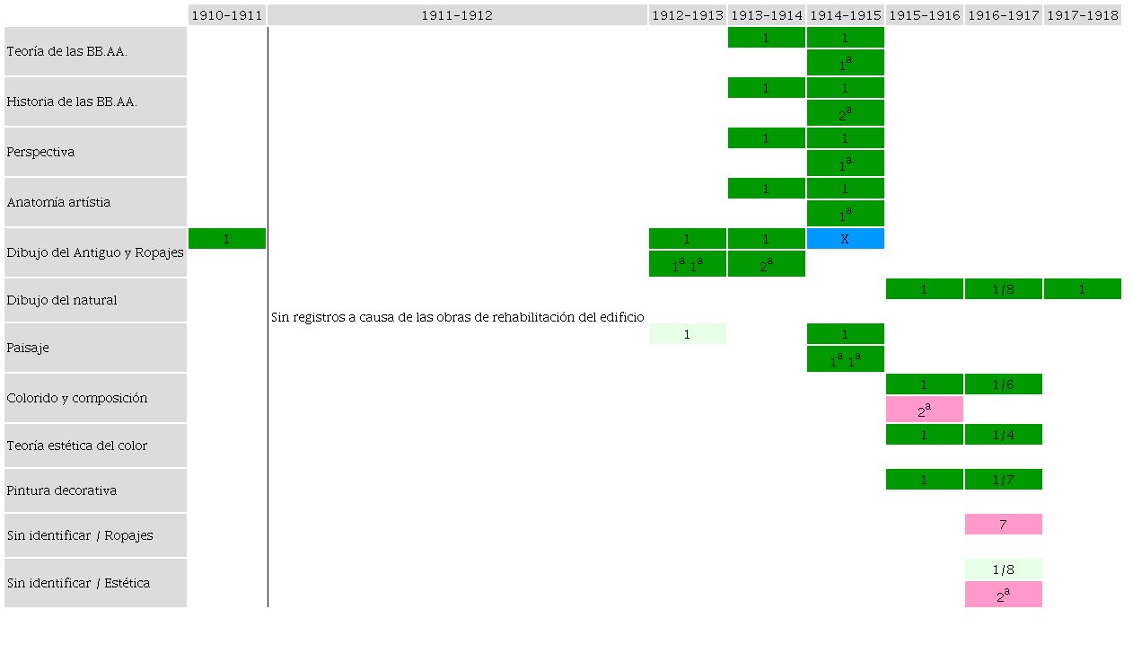 Así continuó hasta septiembre de 1910: al fin, con tres años de retraso, y aun volviendo a suspender en septiembre y en noviembre, logró ingresar en la Escuela;20 acto seguido abandonó el estudio particular de Garnelo, aunque asistiría a sus clases oficiales año tras año.21 La experiencia acumulada junto a él le facilitaría la adaptación a ese entorno educativo -con el que ya estaba familiarizado- donde coincidiría con personajes tan diversos como Alejandro Pardiñas, Juan Adsuara o Pedro Muguruza, entre otros. Tanto es así que el curso 1910- 1911, nada más incorporarse, dice obtener diploma de primera en todas las asignaturas.22