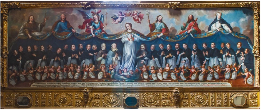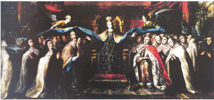 Mientras que en las centurias anteriores el protagonismo de los santos fundadores compitió con las representaciones de los patrocinios de las Vírgenes, el tema de los mantos protectores de las advocaciones marianas más prestigiosas se volvió lo predominante en el XVIII. En dicha centuria, un número indeterminado de estas obras debió estar en ámbitos domésticos y tuvo fines devocionales, de ahí su pequeño formato. Pero una cantidad considerable de las que han llegado a nosotros (aquellas de las que nos vamos a ocupar ahora) fueron encargadas por las corporaciones religiosas para ser colocadas en espacios de visibilidad y tenían una clara finalidad propagandística. Por otro lado, al estar situadas en alto y, dado su gran tamaño, obligaban al observador a levantar la vista y, desde esa posición rebajada, lo integraban al espacio de sumisión representado bajo el manto protector de las imágenes propias de cada orden.12