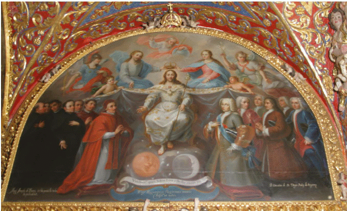 Al colocar al rey y al papa como pilares de la sociedad y al santo como monarca, se sacralizaba el poder espiritual y temporal que tales figuras simbolizaban, aunque en esos tiempos la relación entre ambos estaba lejos de ser tan armónica como ahí se pintaba. Cuando se estaba dedicando la capilla se acababa de firmar el concordato de 1737 entre la monarquía española y la Santa Sede, el cual reforzaba los controles del rey sobre las iglesias de todo el imperio. Por otro lado, la presencia de los jesuitas detrás del Papa no dejaba de ser significativa, dada la defensa a ultranza que la Compañía realizaba de la primacía pontificia (Fig. 13).40