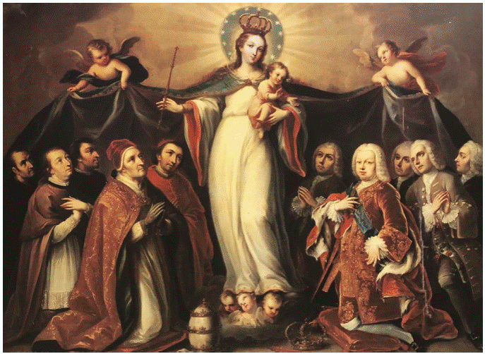 La presencia episcopal en los cuadros de patrocinio se generalizó en una época en la que el regalismo borbónico había dado a los obispos su total apoyo frente a las órdenes religiosas. Aunque en su origen había sido una promoción franciscana, la Inmaculada Concepción se volvió abanderada de los intereses obispales y catedralicios y uno de los cultos más impulsados por la dinastía borbónica. En 1761 el rey Carlos III la juró como patrona universal de los reinos de España y las Indias.