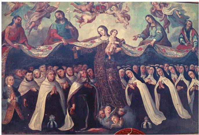 A principios del siglo XVII, las nuevas órdenes llegadas a finales de la centuria anterior también emplearon el esquema del patrocinio de sus santos como discurso para hacer patente su presencia social. El ejemplo más interesante es un gran lienzo de autor anónimo que representa a santa Teresa iluminada por la luz de la paloma del Espíritu Santo volando sobre su cabeza y con el corazón traspasado por la flecha del amor divino en el centro de su pecho, tema de una de sus visiones descrita por ella misma y conocida como la transverberación. La santa recién canonizada en 1622 sostiene en una de sus manos una cruz y en la otra un cordero que reposa sobre el libro de los Evangelios. Dos angelitos ayudan a sujetar los extremos del manto que protege a los miembros de las ramas masculina y femenina de la orden reformada por la santa de Ávila, a quienes se representa arrodillados y con las manos juntas en señal de oración y vasallaje hacia su patrona. Desde el cielo, una Virgen del Carmen coronada sostiene en su regazo a un niño Jesús con el globo terráqueo. A sus lados, san Elías (el fundador mítico de la orden) y san Juan Bautista, colocado sobre el cordero de Dios al que sirvió de precursor, simbolizan el espíritu eremítico con que fue "fundada" la orden en el monte Carmelo (Fig. 3).