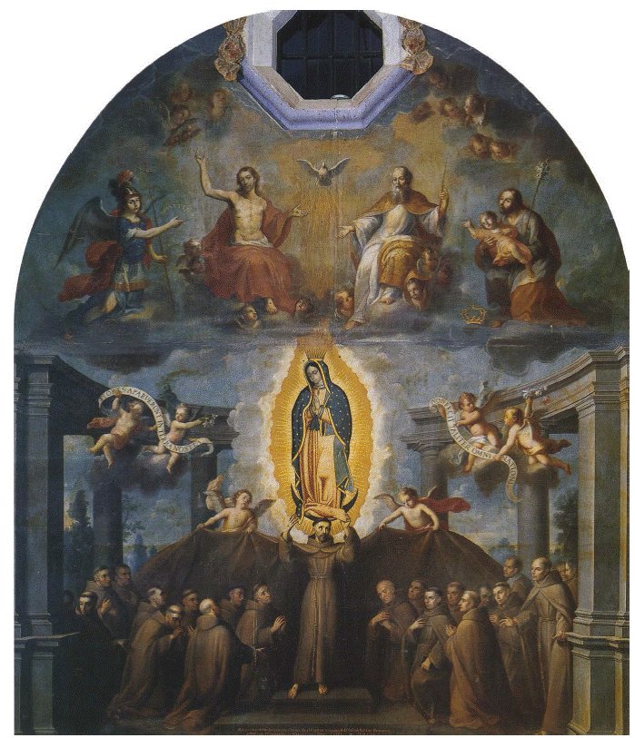 En la Nueva España, la gran fuerza del culto inmaculista coincidió con la promoción, iniciada en el cabildo de la catedral metropolitana y avalada por varios arzobispos, de la advocación a la Virgen de Guadalupe, una represen tación con rasgos indígenas de la Inmaculada Concepción. Esta imagen sirvió como centro de uno de los cuadros de "patrocinio" del siglo XVIII más impresionantes, obra probable del pintor oaxaqueño Miguel Cabrera.25 El lienzo se encuentra en el cubo de la escalera principal del colegio de Propaganda Fide de Zacatecas, dedicado por su fundador, fray Antonio Margil de Jesús, a la advocación guadalupana y cuya ocupación principal eran las misiones entre los pueblos nómadas y la predicación a los fieles en las villas y ciudades del virreinato. A pesar de su independencia del resto de las provincias franciscanas, dicho colegio tenía a san Francisco como su padre fundador y, de hecho, este santo es el que porta el enorme manto marrón sostenido por angelillos bajo el cual aparece la comunidad de frailes, encabezada por el mismo fundador del colegio fray Antonio Margil, cuyo proceso de beatificación se llevaba en Roma por entonces.