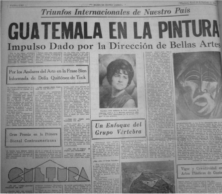 En una nota (Fig. 11) del 30 de septiembre de 1971 publicada en el Diario de Centroamérica, se entrevistó a Delia Quiñonez, vocera de relaciones públicas de la Dirección General de Artes Plásticas o bien de la entonces Dirección General de Bellas Artes. En la nota Quiñonez comentó: "Guatemala fue la señora de la Bienal, es decir, se notó la preeminencia de las artes plásticas nacionales por sobre la de otros países del área centroamericana".64 Tal fue la tónica de las notas que se consultaron para el caso de Guatemala. Este país, sin titubear, celebró que Luis Díaz "se tragó" la Bienal.