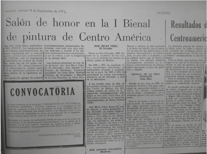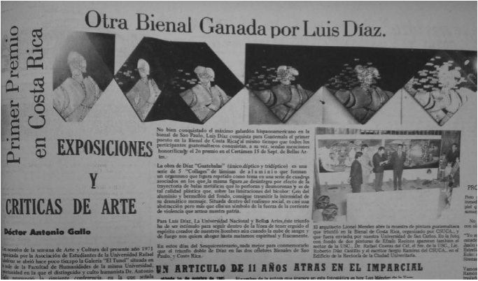 A la celebración de los artistas, se suman algunas imprecisiones que aparecieron en la prensa de Guatemala. Un ejemplo de ello está en la edición del 19 de septiembre de 1971, del periódico El Gráfico, donde se lee66 que, si bien Díaz había ganado el gran premio de 3000 dólares en la Bienal de Costa Rica, se le había dado una mención a todos los artistas guatemaltecos que participaron en el concurso. Además, se afirmó que los demás países de la región ganaron 1000 dólares, cada uno, del premio nacional. Estos dos últimos datos son falsos: los artistas guatemaltecos no recibieron mención honorífica alguna, si bien en el acta del jurado se destacó el trabajo de Elmar Rojas y Roberto Cabrera, y se felicitó en general a la delegación chapina.