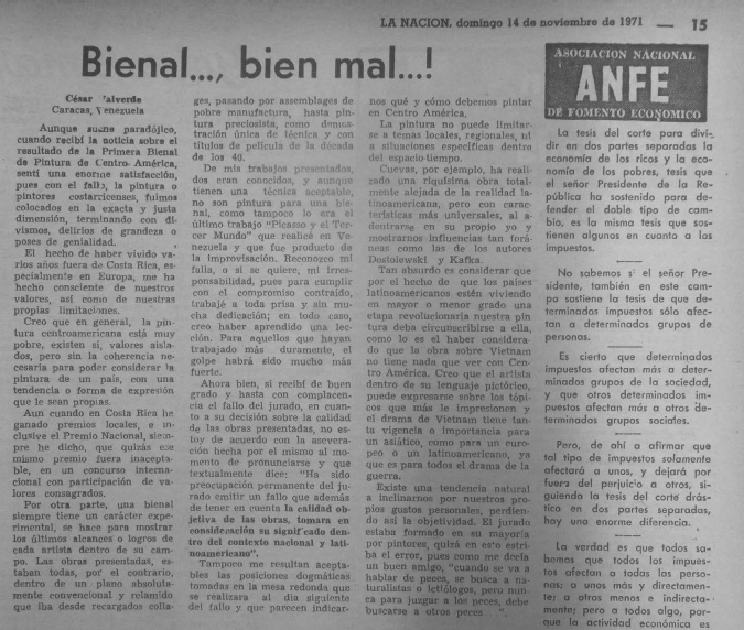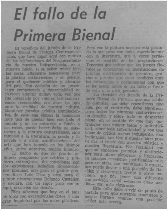 En una editorial, el periódico La Nación publicó una nota optimista que decía: "El veredicto del jurado de la Primera Bienal de Pintura Centroamericana es, a nuestro juicio, altamente beneficioso para la plástica costarricense, y en general para el quehacer estético y literario del país [...] nos abre los ojos ante la realidad de nuestra cultura."42 La nota continúa señalando que la calidad de los miembros del jurado era evidente, y que las protestas que habían surgido del grupo dejaba ver la cultura complaciente del típico crítico "criollo" costarricense, quien "sigue la costumbre muy tica de quedar bien con todo el mundo y de no entrarle a fondo a las cosas".43