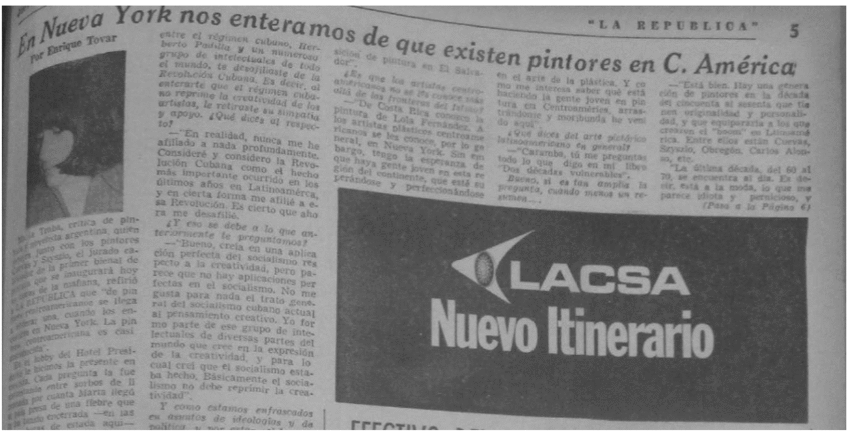 De hecho, el tema sobre su lejanía con Centroamérica aparece en la prensa de la época, como sucedió en el periódico La República. Ahí, el periodista Enrique Tovar le consultó a Traba "¿Por qué no se menciona un artista costarricense en 'Dos décadas vulnerables'?",15 a lo que la autora contestó: "En cuanto a la pintura costarricense, tengo muy poco criterio porque no la conozco, y en general de toda Centroamérica. Ésta es la segunda vez que vengo al istmo. Hace pocos años asistí a una exposición en El Salvador" (Fig. 5). Por eso en 1971, cuando junto con los demás miembros del jurado participó de la Bienal de Pintura, Traba manifestó expresamente su deseo de utilizar la oportunidad para conocer el "arte joven de la región".16