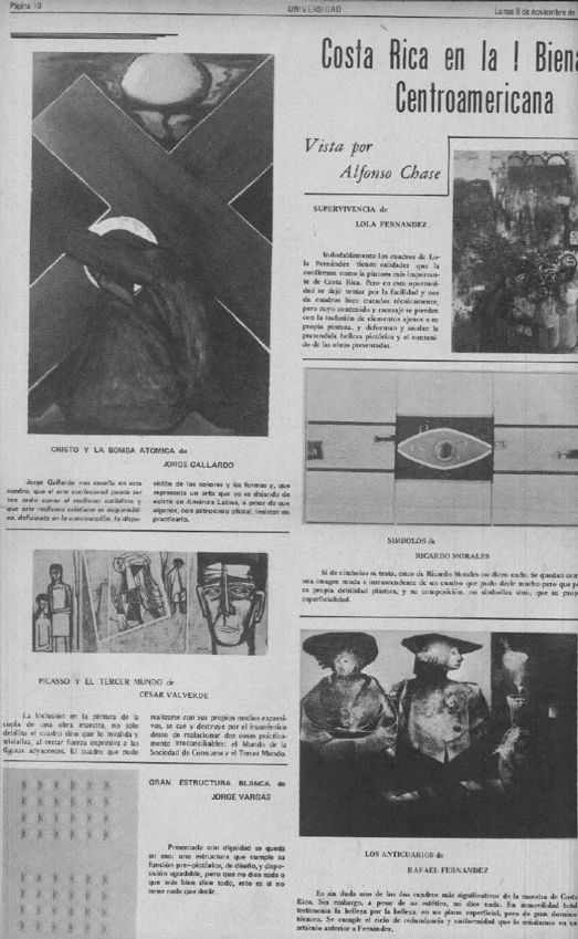 En cambio, columnistas como Alfonso Chase criticaron severamente cada una de las obras costarricenses que participaron en la Bienal; esto lo hizo Chase en las páginas del Semanario Universidad, diario de la Universidad de Costa Rica. Sobre la pieza Supervivencia (1971) de Lola Fernández, Chase dijo que, "En esta oportunidad LOLA [sic] se dejó tentar por la facilidad y nos da cuadros bien tratados técnicamente, pero cuyo contenido y mensaje se pierden con la inclusión de elementos ajenos a su propia pintura".38 Con este comentario Chase se ajusta a lo que el fallo del jurado había dicho, a saber: Lola Fernández había sido hábil en su técnica, pero su obra no brindaba un contenido claro y contundente.