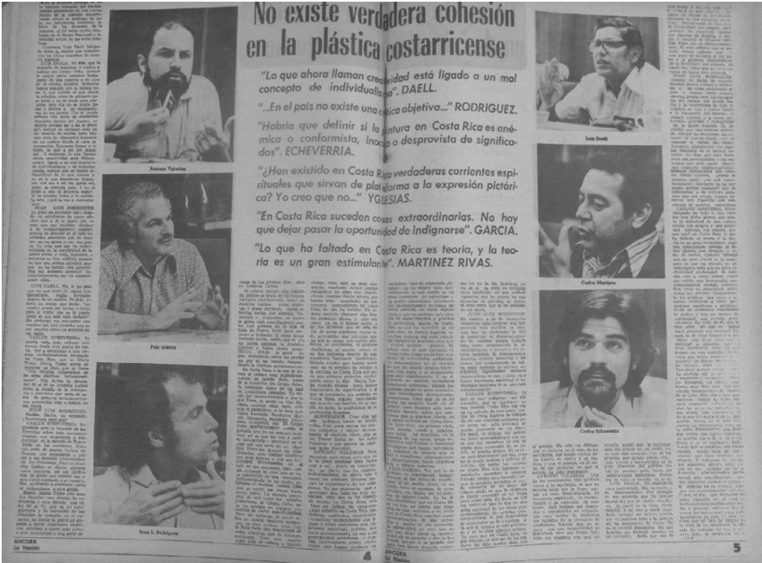 El último eje sobre el debate que suscitó el fallo del jurado tuvo que ver con el contenido y la identidad de la plástica costarricense. Como se ha visto, la contundencia del veredicto también motivó la apropiación local de la lectura que realizó Marta Traba y el resto del jurado sobre el arte centroamericano, en especial con relación a los criterios teóricos expresados en sus publicaciones. A razón de esto, la autora colombiano-argentina volvió a aparecer en la prensa en 1975 en un panel titulado nada más y nada menos: "No existe verdadera cohesión en la plástica costarricense."57