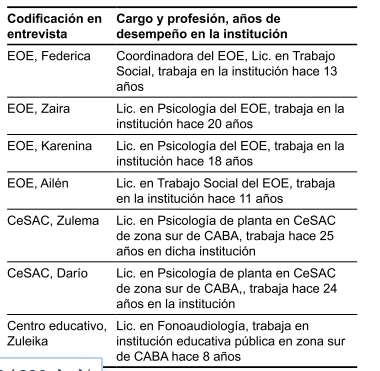 Se realizaron siete entrevistas semiestructuradas a profesionales de nacionalidad argentina: cuatro a integrantes del EOE (dos trabajadoras sociales y dos psicólogas) y tres a informantes clave que trabajan con población infantil migrante en el subsector público de salud y educación en zona sur de CABA (una fonoaudióloga que se desempeña en un Centro Educativo para la Atención de Alumnos con Trastornos Emocionales Severos, una psicóloga infantojuvenil de planta de un Centro de Salud y Acción Comunitaria y un psicólogo de planta de otro Centro de Salud).