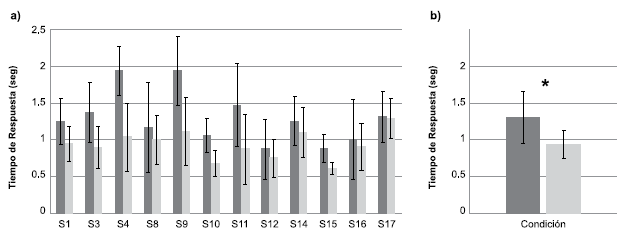 a). Promedio del tiempo de respuesta de las respuestas correctas para la condición Entrenada Ensombrecida (gris oscuro) y Entrenada Saliente (gris claro), el asterisco señala un p < .01 b).