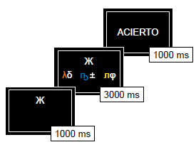 El sujeto debía seleccionar la comparación correcta en relación a la muestra que aparecería en pantalla mediante las flechas del teclado. El criterio para considerar la adquisición de las relaciones derivadas fue > 75% de aciertos para cada tipo de relación (14/18) . En cada trial el estímulo de muestra aparecía en la parte superior de la pantalla por un segundo y luego aparecían dos estímulos de comparación en la parte inferior. El participante disponía de tres segundos, desde la presentación de las comparaciones, para responder. En esta tarea no se le informaba al sujeto si sus respuestas eran correctas. Si el sujeto no llegaba a responder dentro del tiempo establecido se presentaba una mensaje con la inscripción “Demasiado lento”, el cual aparecía en la pantalla por un segundo. En todos los bloques el orden de presentación de los estímulos fue aleatorizada para eliminar cualquier efecto de orden.