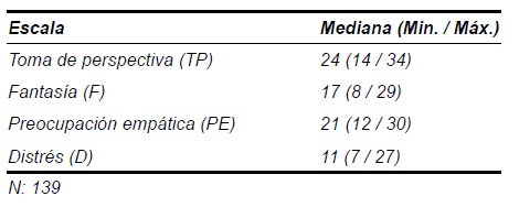 La variable empatía, fue operacionalizada a través de la escala Índice de Reactividad Interpersonal (IRI) de Davis (1983) en su versión adaptada al español de Mestre Escrivá, Frías Navarro y Samper García (2004). Este inventario consta de 28 ítems con respuesta likert de 5 opciones, que van desde “No me describe bien” a “Me describe muy bien”, oscilando entre valores de 0 a 4 puntos. Los puntajes se agrupan en 4 escalas de 7 ítems cada una, evaluando dos de ellas los aspectos cognitivos de la empatía y las otras dos, la reacción emocional del individuo al adoptar una actitud empática.