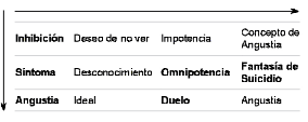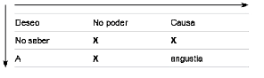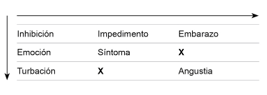 · En segundo lugar, veremos que Lacan irá cambiando los términos -con la excepción de la angustia, que es el único que figura en todos los cuadros- y hará un movimiento similar: presentará un cuadro con algunos espacios vacíos para completarlo en la última clase. Podemos decir que es el mismo cuadro que va sufriendo modificaciones pero también existe la posibilidad de pensarlos como dos cuadros diferentes. La serie de la primera presentación sería la siguiente:
