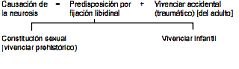 Freud, a lo largo de su obra, categoriza ciertos elementos psíquicos como “típicos[20]”, i. e., elementos constantes que se repiten de igual manera en todas las personas. Es el caso del simbolismo, las teorías sexuales infantiles, los sueños típicos, la herencia arcaica y las Urphantasien. El estatuto de lo típico-universal en su doctrina es capital y requiere más atención de la que hoy en día recibe. Situemos el esquema de las series complementarias referido en las conferencias de 1916-17: