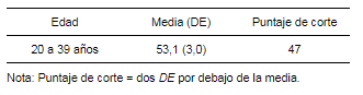 Dado que no se hallaron diferencias entre los grupos de edad, se reporta la media y la desviación estándar, así como también el puntaje de corte sugerido para la población de jóvenes adultos de 20 a 39 años de edad (tabla 5). Este puntaje de corte se calculó de acuerdo a los lineamientos de Allegri et al. (1997), es decir considerando dos desviaciones estándar por debajo de la media
