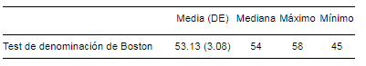 La tabla 1 muestra los estadísticos descriptivos obtenidos del rendimiento de la totalidad de la muestra en el Test de Denominación de Boston