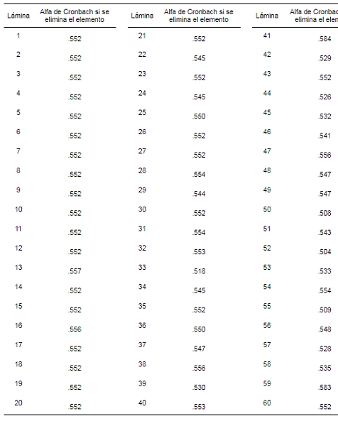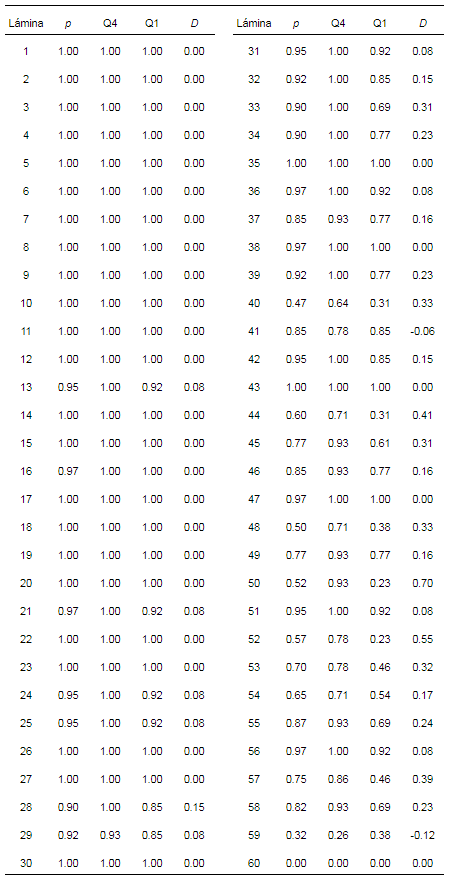 El índice de dificultad medio de las láminas del test fue de 0.88 (0.2) y la discriminación media de los ítems fue de 0.10 (0.16). En la tabla 2 se muestran los valores de la dificultad y la discriminación para cada una de las láminas.