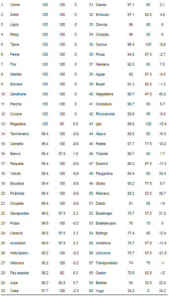Un resultado a destacar fue que en el caso de los ítems 40 (magdalena), 48 (pergamino), 50 (pelícano), 52 (espárrago), 59 (bellota) y 60 (yugo) el desempeño de los participantes de la muestra arrojó un porcentaje de acierto muy bajo en comparación a los reportados por Allegri (ver tabla 3).