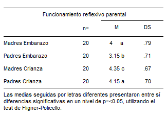 En el estudio mencionado (Duhalde, 2007), 20 parejas fueron entrevistadas durante el 7mo mes de embarazo y a los 7 meses de vida de su primer hijo. Hombres y mujeres fueron entrevistados individualmente, por separado. Para evaluar el Funcionamiento Reflexivo Parental, se seleccionaron específicamente los párrafos de las entrevistas en que se respondieran preguntas referidas al bebé y al vínculo con él. Este procedimiento -para el que se tuvieron especialmente en cuenta los criterios expuestos por Slade, Bernbach, Grienenberger, Wohlgemuth Levy y Locker (2004)- se llevó a cabo por separado con la transcripción de la primera entrevista y con la transcripción de la segunda entrevista, realizada en la crianza. Se encontró una diferencia significativa entre el nivel de funcionamiento reflexivo parental de las madres durante el embarazo, los padres durante el embarazo, las madres en la crianza y los padres en la crianza (KW=37.210, p=<0.001). Para determinar cuáles eran los valores que diferían significativamente entre los cuatro grupos, se realizó el test no paramétrico de Comparaciones de Pares de Fligner-Policello. Se encontró que mientras que el nivel de funcionamiento reflexivo parental durante el embarazo y en la crianza era similar para las madres, los padres aumentaban significativamente este nivel en el momento de la crianza (KW 37.210 p=<0.001). Este resultado parece indicar, de modo especialmente destacado en los varones, un impacto de la práctica de la parentalidad sobre la experiencia, despliegue y enriquecimiento de los recursos subjetivos, como el Funcionamiento Reflexivo.