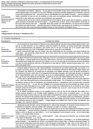 Resumen: Se trata de un estudio de caso único (N=1) para conocer el trauma, el apego y la resiliencia desde las manifestaciones de un adulto de 29 años, víctima de abuso sexual desde la infancia temprana hasta la adolescencia. Los datos fueron recolectados a partir de tres entrevistas: una inicial semiestructurada (ad hoc), una entrevista abierta, que exploró la experiencia traumática, y la Entrevista de Evaluación Intergeneracional del Apego (Adult Attachment Interview, AAI) de Marrone. Para el análisis se predefinieron categorías y subcategorías de análisis con base en las áreas de estudio y la teoría existente; finalmente, se realizó un análisis estructurado de interpretación de códigos verbales a través de técnicas cualitativas, lo que permitió describir, comprender e integrar la información obtenida del sujeto y presentarla en un estudio clínico de enfoque cualitativo y de tipo descriptivo.