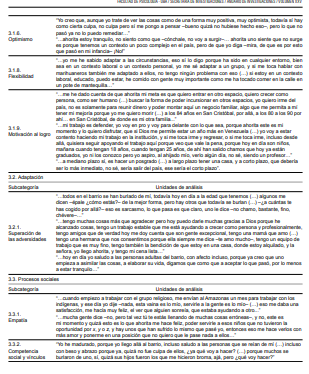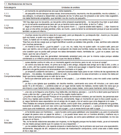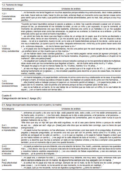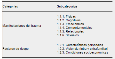 · Categorización de la información, organizándola por temas: trauma, apego y resiliencia. Luego, desde un abordaje cosmológico (Hurtado, 2015) se predefinieron diferentes categorías y subcategorías, tomando como referencia las áreas de estudio.
