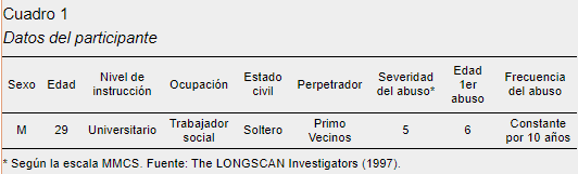 Este artículo analiza una realidad particular mediante un estudio de caso único (N=1), con énfasis en la técnica de la entrevista, y su interpretación a través del análisis cualitativo de categorías y subcategorías, en el que se entrelaza la subjetividad del participante y la reflexividad del investigador como método de análisis e investigación. Así mismo, nos interesamos principalmente en crear un espacio que le permitiera al sujeto expresar las peculiaridades de su vivencia con el fin de acceder a los datos en su entorno natural. El muestreo fue de tipo intencional, no probabilístico, con el requisito de inclusión: adulto con antecedente de abuso sexual infantil. El proceso de categorización y su análisis, así como la comprensión e integración, se basó en los datos empíricos procedente del trabajo de campo y la literatura revisada.