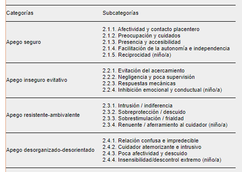 Mediante sus investigaciones, Ainsworth (1979) logró clasificar tres patrones de apego; posteriormente, Main y Hesse (1990, c.p. Marrone, 2001) plantearían una cuarta categoría.