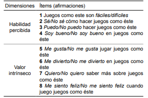 Las primeras afirmaciones de la escala eran de prueba: “Me gusta / No me gusta la pizza”, y “Me gusta / No me gusta jugar en la juegoteca”. Luego, para evaluar la percepción habilidad percibida se utilizaron otros 4 ítems: “Juegos como éste son fáciles / difíciles”, “Sé / No sé cómo hacer juegos como éste”, “Puedo / No puedo hacer juegos como éste”, y “Soy bueno / No soy bueno en juegos como éste”. Para evaluar el valor intrínseco hacia la tarea: “Me gusta / No me gusta jugar juegos como éste”, “Me divierto / No me divierto jugando juegos como éste”, “Quiero / No quiero saber más sobre este juego”, “Me siento feliz / No me siento feliz cuando juego a cosas como ésta”. En la Tabla 1 pueden observarse los ítems correspondientes a la escala.