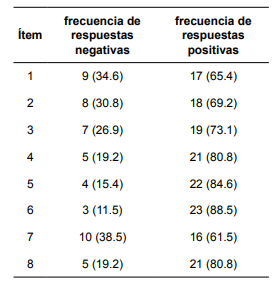 Tabla 2. Distribución de frecuencias y porcentajes de respuestas ante los ítems de cada una de las dimensiones (habilidad percibida: ítems 1 a 4; valor intrínseco: ítems 5 a 8) obtenidos en estudio realizado con niñas y niños de 4 años para evaluar la motivación acerca de una tarea de planificación.