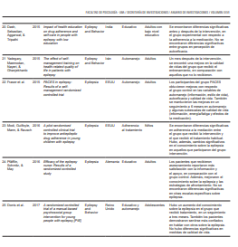 En primer lugar, encontramos una amplia variedad de abordajes orientados a la educación y al entrenamiento en el automanejo de pacientes con epilepsia. La mayoría de éstos se encontraban centrados en variables como adaptacion a la enfermedad, conocimiento sobre la epilepsia, adherencia al tratamiento y calidad de vida.